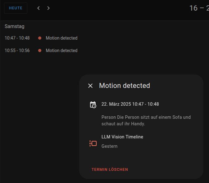 Eine zusätzliche coole Funktion, ist Timeline. Klickt dafür auf „Einstellungen – Geräte und Dienste – LLM Vision – Eintrag hinzufügen“ und wählt „Timeline“ aus. Nun erstellt LLM Vision einen Kalender und schreibt alle Ereignisse mit Datum und Uhrzeit als Kalendereintrag hinein. Den Kalendereintrag findet Ihr in der eingebauten Kalender Funktion von Home Assistant.