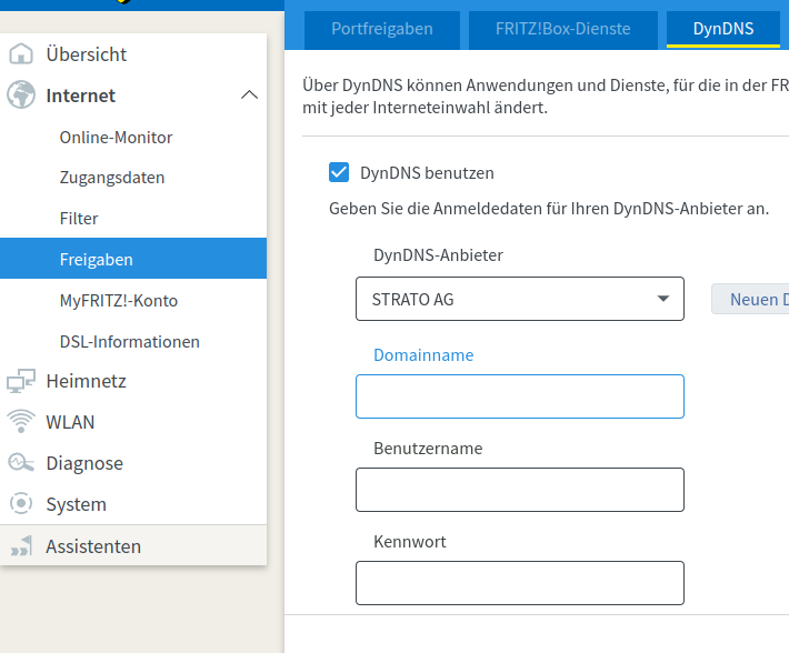 In der Fritzbox, könnt ihr eure Daten unter „Internet – Freigaben – DynDNS“ eintragen. Soweit so normal.