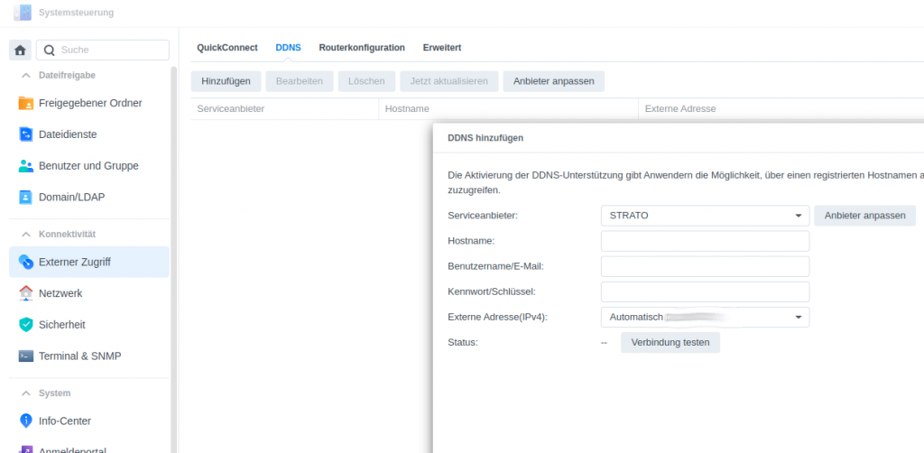 Was manche von euch vielleicht nicht wissen: eine Synology NAS bietet ebenfalls eine solche Funktion. Die Einstellungen hierzu findet ihr unter „Systemsteuerung – Externer Zugriff – DDNS“