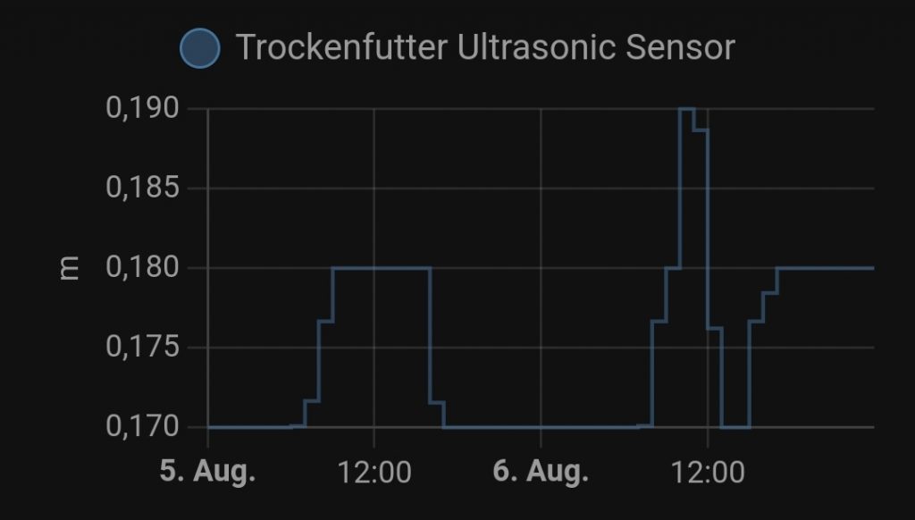 Aber warum entspricht dieser Aufbau nicht so ganz meinen Vorstellungen? Ganz einfach: ich habe sehr große Schwankungen in den Messwerten, auch wenn sich nichts verändert ist. Ich gehe davon aus, dass es daran liegt, dass Ultraschall Sensoren am besten funktionieren, wenn sie den Abstand zu einer Ebenen Fläche messen. Dadurch, dass das Trockenfutter natürlich eine sehr unebene Struktur hat, kommt es wahrscheinlich zu diesen Schwankungen.